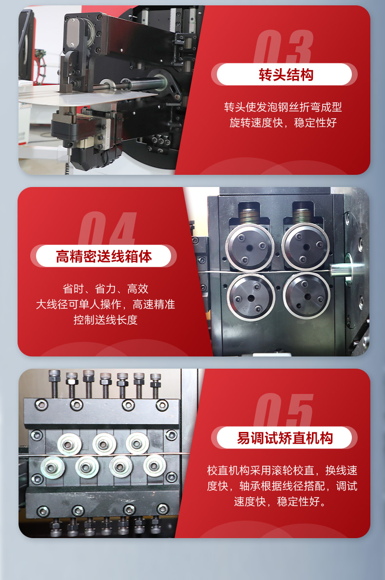產品特點:送線箱采用3-4組同步送線,保證送線精度及穩定性;可自由配套自動焊機、焊鋼珠、倒角、切槽、壓扁、沖孔、打凸臺、車螺紋、車槽、扁鋼帶沖孔加折彎等功能。
